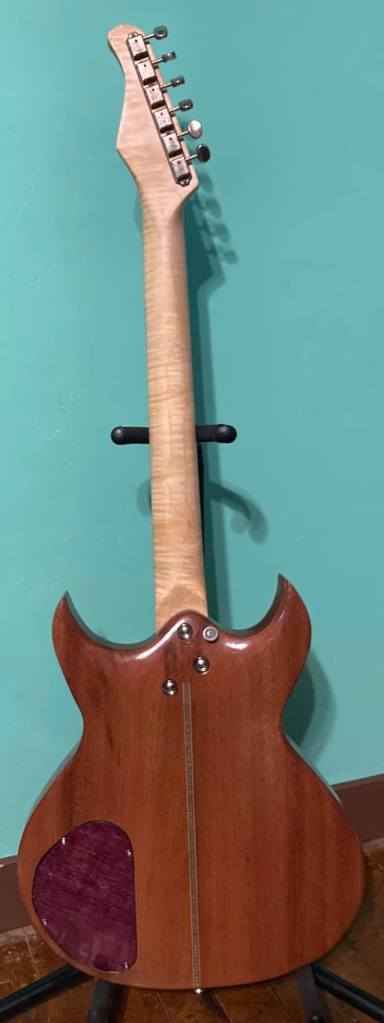 The second (actually this is the third, I also built a baritone) seen here is made of mahogany and hard maple with a three piece neck with an ebony fretboard. It has DiMarzio pickups with push/push coil taps on the volume and tone controls for a total of 8 switching options! Absolute shredder of a guitar.